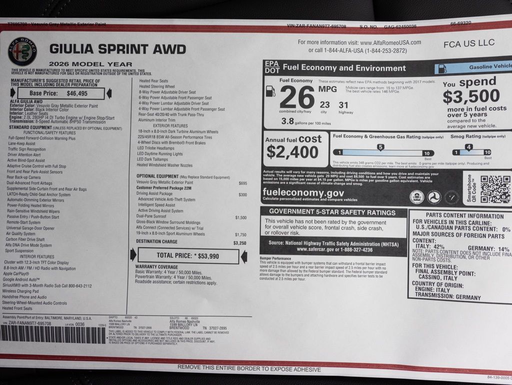 Sporty, balanced, and unmistakably Italian, this 2026 Alfa Romeo Giulia Sprint AWD is finished in Vesuvio Gray Metallic over a Black leather interior, a sharp and modern specification that highlights the Giulias athletic design and driver focused character. Purpose built to deliver both everyday comfort and engaging performance, the Giulia Sprint remains one of the most rewarding sedans in its class.